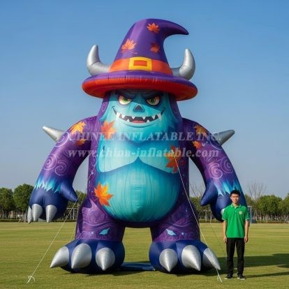 Make your fall events unforgettable with the Cartoon3-306 Halloween Monster Inflatable Cartoon from Chinee Inflatables Inc. This towering character features a playful yet slightly spooky look, complete with a wide-brimmed wizard hat, horns, and stylized spikes. Vivid printing in blues and purples with swirling textures and autumn leaves delivers instant visual impact, making it a perfect focal point for parks, schools, shopping centers, farms, and festival grounds.