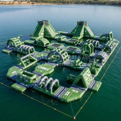 Command attention on the water with the S292 Military Style Water Park by Chinee Inflatables. This modular floating adventure course features a bold military-green palette with star accents and a strategic layout designed for nonstop action. Multiple climbing towers, arched crawls, balance beams, hurdles, jumps, and slide sections connect into a large circuit, letting guests choose their own route for timed runs or casual play. The maze-like configuration encourages exploration while keeping traffic flowing smoothly for groups of all sizes.