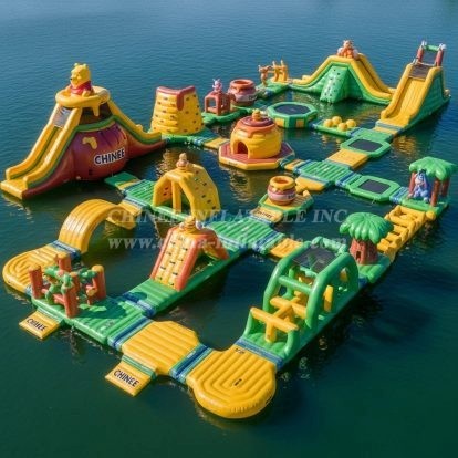 Bring storybook adventure to the water with the S295 Winnie the Pooh Water Park by Chinee Inflatables. This large floating course features multiple slides, climbing walls, balance beams, crawl tunnels, trampolines, and hop pads arranged into a connected circuit for continuous play. Bright honey-pot accents, friendly bear and tiger figures, and lush palm details create an inviting themed environment that delights families and boosts park appeal.