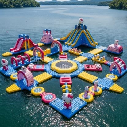 Bring instant crowd‑pulling magic to your lakefront or resort with the S344 Hello Kitty Water Park. This colorful floating attraction blends multiple play zones into a single modular layout—featuring tall multi‑lane slides, arc tunnels, balance beams, a central jump/trampoline pad, climbing walls, and whimsical Hello Kitty figures that guide guests around the course. Designed for high throughput and nonstop fun, the park supports simultaneous play across many stations so families, kids’ groups, and camp programs can rotate smoothly without waiting.