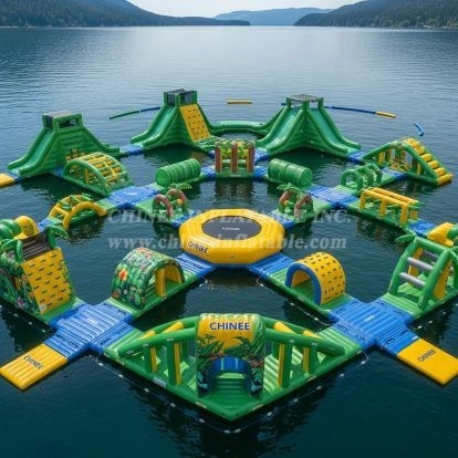 Bring high–impact excitement to your waterfront with the S384 Jungle Theme Water Park from Chinee Inflatables. This modular floating course blends lush jungle artwork with a thrilling mix of challenges, including twin climbing slides, crawl tunnels, rollers, balance beams, stepping pads, and a central bounce/trampoline pad. Designed for lakes, calm seas, or resort lagoons, it turns any body of water into a premium attraction that keeps guests circulating and smiling for hours.