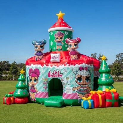 Bring holiday magic to your next event with the T2-8590 L.O.L. Surprise Christmas Theme Inflatable Bouncer from Chinee Inflatables Inc. This festive bounce house features bright red and green colors, snowflake graphics, gift box accents, and inflatable Christmas trees topped with stars—perfect for winter fairs, school celebrations, and backyard parties. Large L.O.L. Surprise character artworks and 3D toppers instantly attract attention and make for unforgettable photo moments.