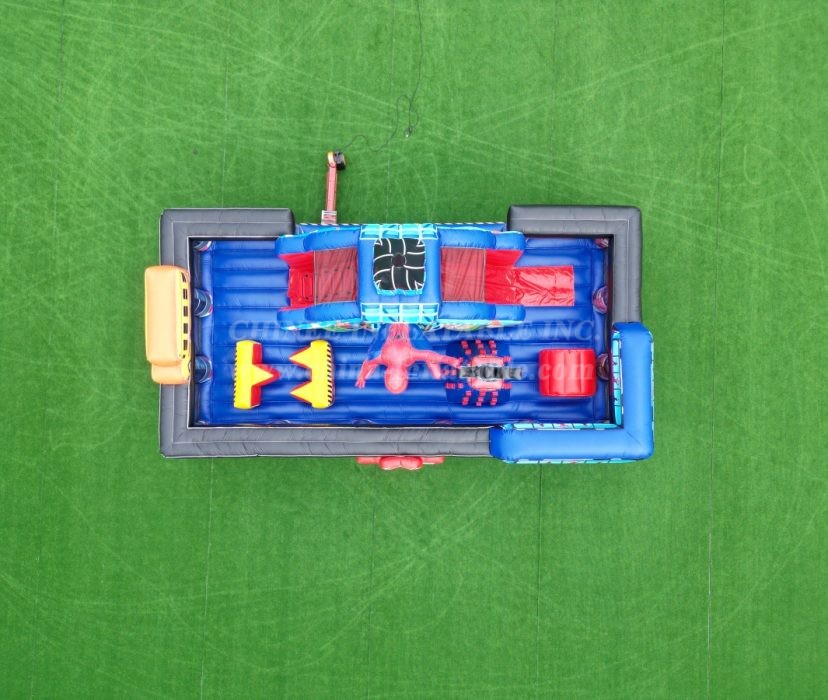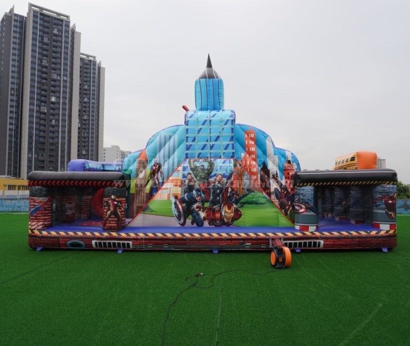 Explore the two distinct levels of heroic adventure: 💥 Lower Obstacle Arena: Enter the city streets and navigate a thrilling obstacle course filled with superhero-themed pop-ups, pillars, and bouncing areas. The high-visibility mesh keeps everyone safe while the vibrant comic book graphics bring the action to life. 🏙️ Upper City Deck: Climb to the top and find yourself on a city rooftop! This upper level features incredible 3D inflatable elements, including a school bus and a tour bus, creating a unique play space with a stunning view.