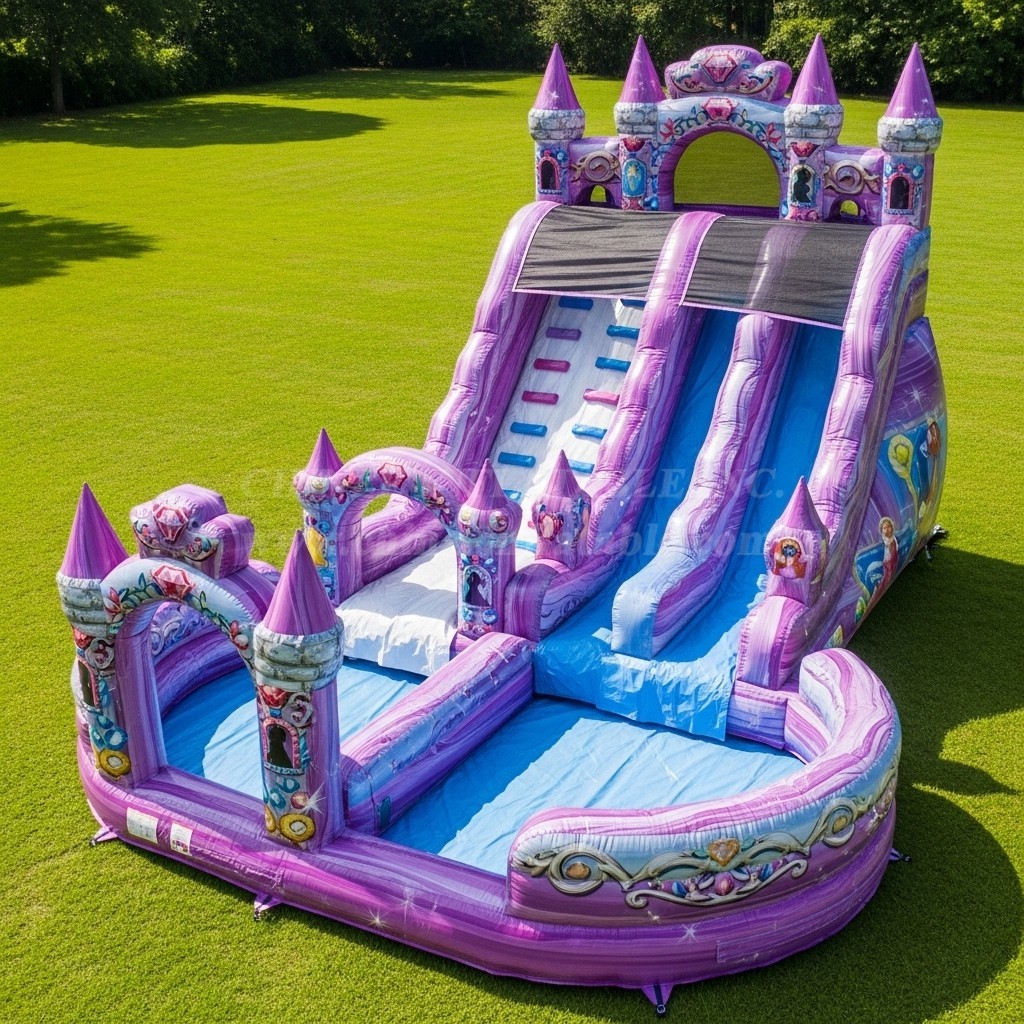 Bring fairytale magic to your next event with the T8-8771 Princess Castle Theme Inflatable Dry Slide by Chinee Inflatables Inc. This eye‑catching slide features a majestic pink-and-lavender castle facade with turrets, arches, and sparkling decorative artwork that instantly transforms any lawn, school yard, or party venue into a royal playground. Twin slide lanes and an easy-access central climb keep lines moving, while the wide splash-style landing area provides a safe, cushioned finish for riders. Built with our heavy-duty, commercial-grade PVC and reinforced stitching, this slide is engineered for high throughput and long service life—ideal for rental fleets and frequent event use. Safety comes first: tall side walls, a shaded top cover over the sliding lanes, secure anchor points, and a clearly defined rider pathway help operators manage crowds with confidence. The vibrant digital prints resist fading for a lasting, picture-perfect presentation. Whether you’re hosting community festivals, school fun days, or backyard celebrations, this princess castle slide delivers non-stop excitement and a premium, storybook look that guests love. Backed by Chinee Inflatables’ 20+ years of manufacturing expertise and global export experience, the T8-8771 arrives ready to work with blower, repair kit, and detailed instructions. Customize sizes and colors to fit your space or brand, and count on responsive support from our Guangzhou factory team. Make every event feel royal with a slide that combines show-stopping appearance, durable construction, and smooth, safe performance.
